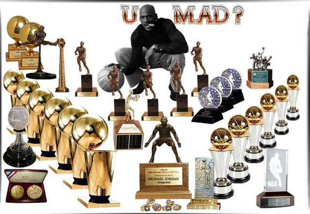 没错,他是第一,他的奖杯总数是第一,但是他得排在第二,为什么?慢慢说来,乔丹NBA篮球生涯一共22座奖杯,6个总冠军,6个FMVP,3个AMVP的,5个MVP的,一个最佳新秀的,一个最佳防守球员的。
